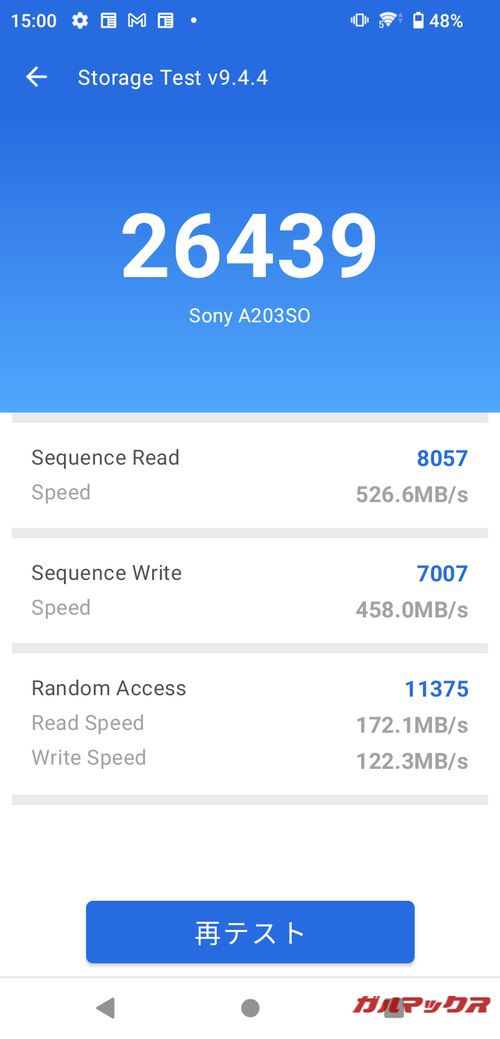 ▼ストレージ速度は読み込みが526.6MB/s、書き込みが458MB/s。↓