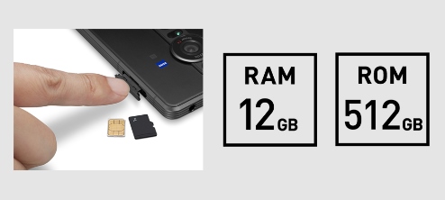 ▼内蔵メモリ(RAM)は12GB、本体容量(ROM)は512GBとハイエンドらしいハイスペックさ。さらにMicroSDカードによる容量拡張にも対応しています!↓