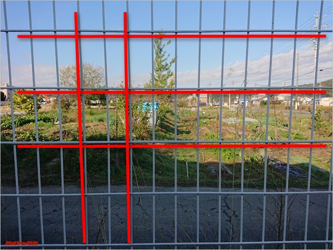 ▼被写体は曲がりのない金網。もちろん、金網が歪んでいないことを撮影時に確認しているので、写真の歪みはXperia XZ1 Compact(G8441)特有の症状です。↓