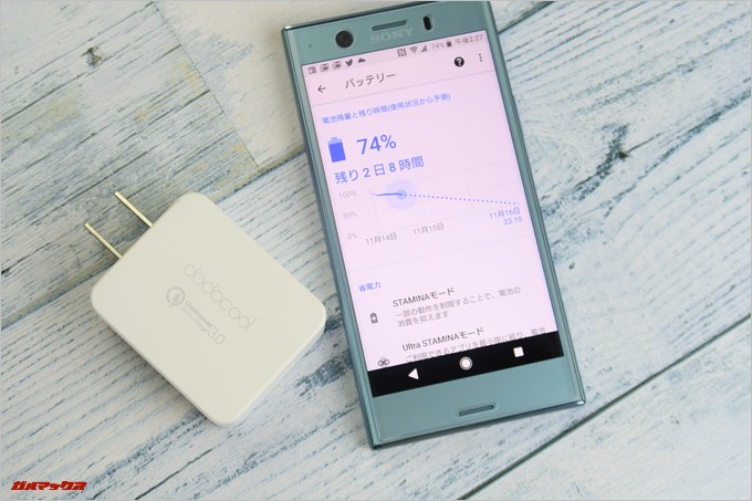 Xperia XZ1 Compact(G8441)は超高速充電技術のQC3に対応しているので、充電時間もめちゃくちゃ早かったです。