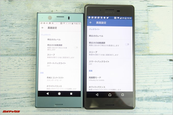 ▼Xperia XZ1 Compact(G8441)とXperia X Dualで輝度最大、表示モードはスタンダートで並べてみました。↓