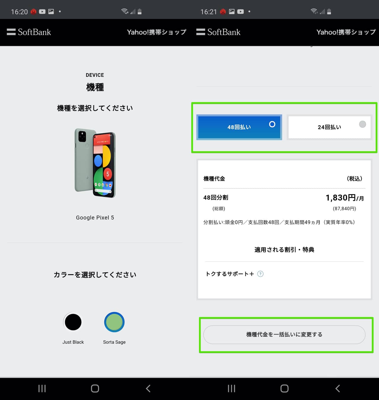 ▼Yahoo!携帯ショップで選択した機種が表示されるので、カラーや支払い方法を選びましょう!支払い方法は48回払い、24回払い、一括払いから選択可能↓