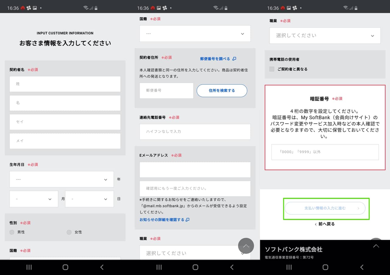 ▼続いては契約者名などの「お客さま情報」の入力画面です!入力が終わったら「支払い情報の入力に進む」をタップ↓