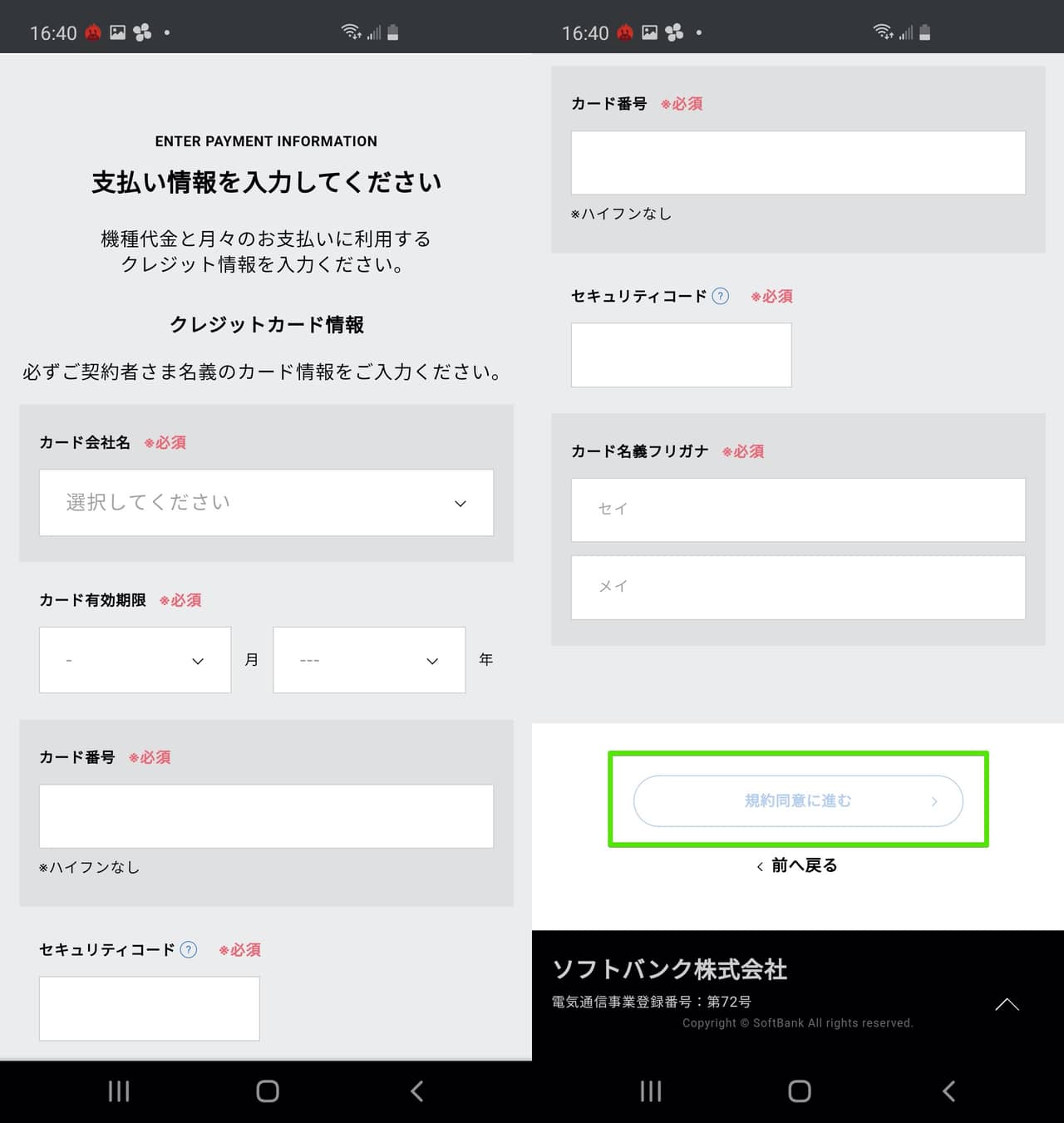 ▼続いては支払い方法です!クレジットカードの情報を入力して「規約同意に進む」をタップ!