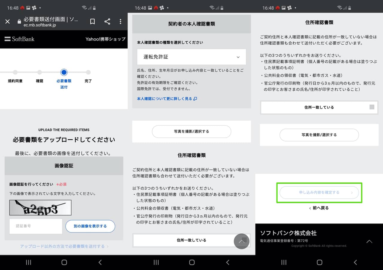 ▼最後に本人確認書類などのアップロードです!画像認証を行い、運転免許書などは「写真を撮影/選択する」から予め用意していた写真の選択やその場での撮影も可能です!必要書類のアップロード後は住所確認が一致していることを確認してチェックを入れ、「申込内容を確定する」をタップ↓