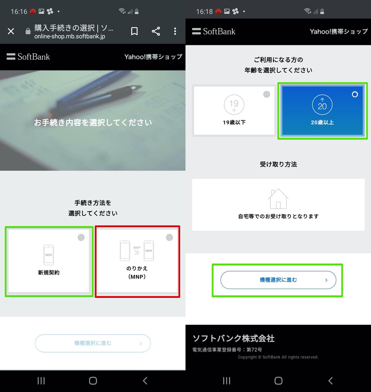 ▼ソフトバンクのオンラインショップに繋がったら「新規契約」をタップして年齢(20歳以上でないとオンラインショップが使えないので注意!)を選択!受け取りは自動的に自宅となります!最後に「機種選択に進む」をタップ↓