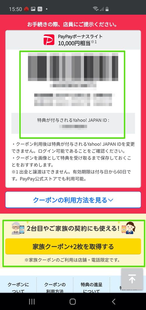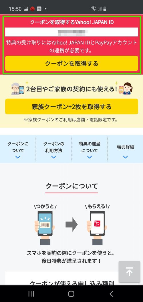 ▼Yahoo!携帯ショップのキャンペーンページで「クーポンを取得するYahoo! JAPAN ID」を必ず確認しましょう!ここに表示されているアカウントでPayPayボーナスライトを受け取ることになります!アカウントを確認したら「クーポンを取得する」をタップ↓