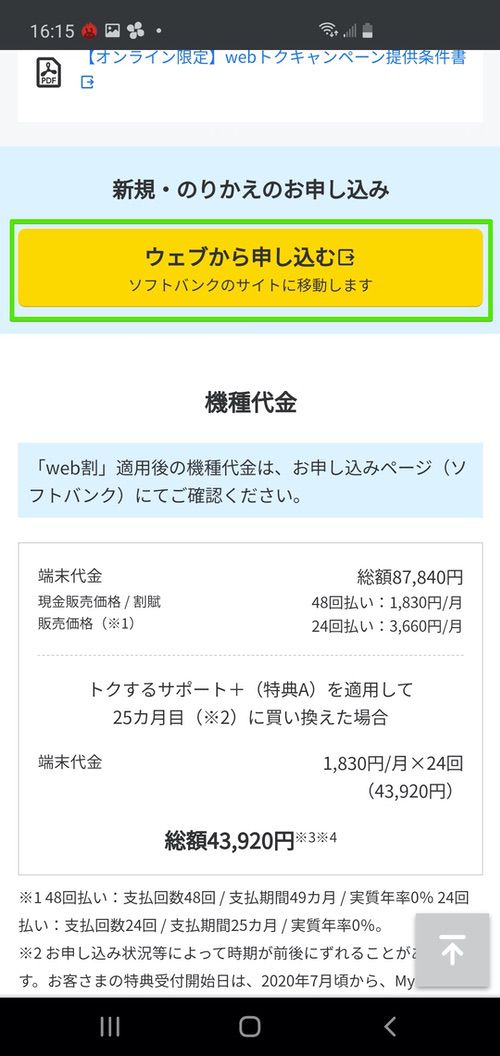 ▼さらにスクロールして「ウェブから申し込む」をタップ↓