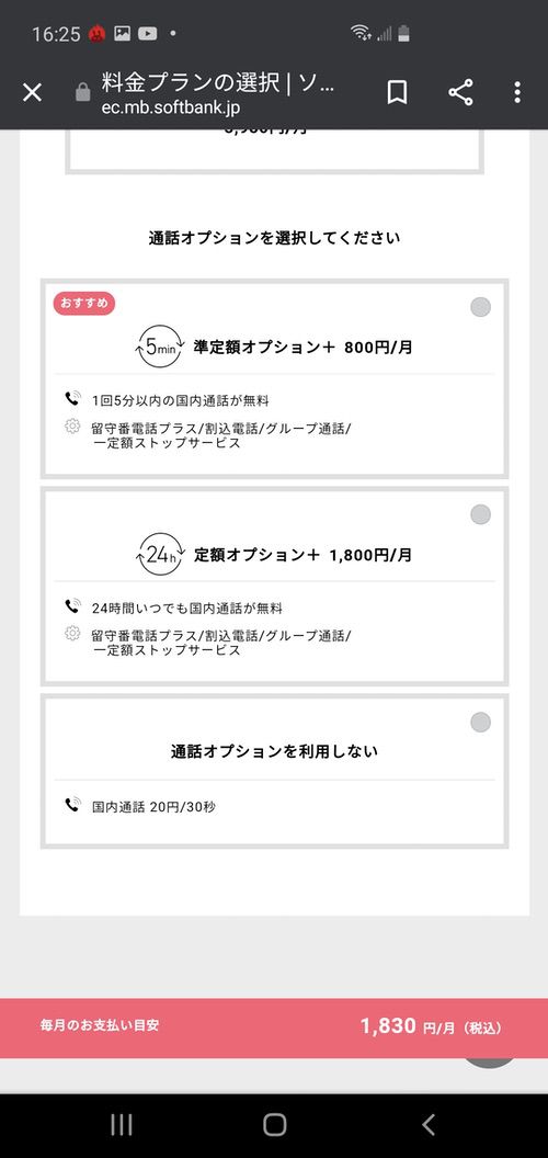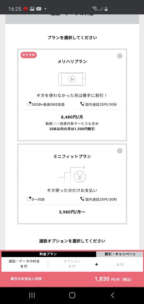 ▼続いては通話オプションの選択です!5分以内かけ放題、24時間かけ放題、従量課金(30秒30円)の3つから選択可能なので自身に合う通話オプションを選択しましょう↓