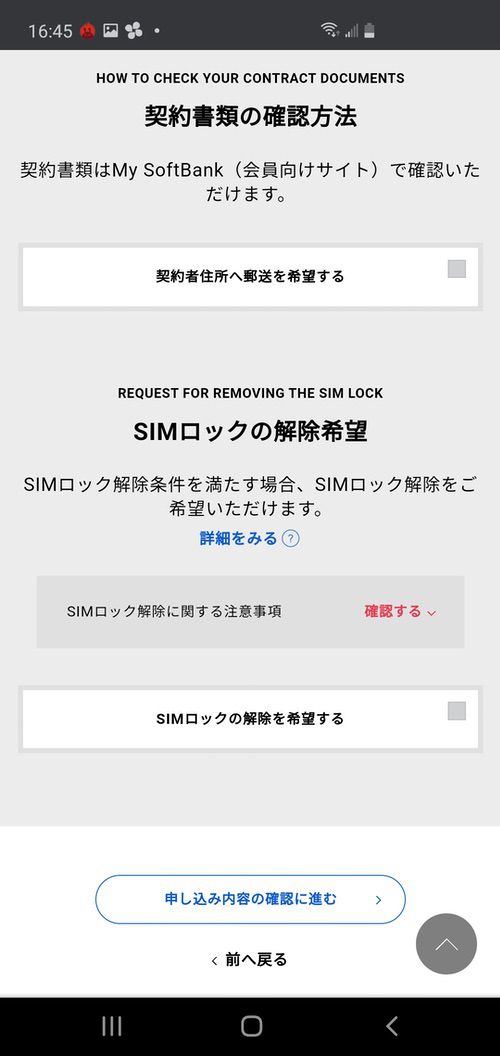 ▼少しスクロールして「契約書類の確認方法」と「SIMロック解除希望」で希望があればチェックを入れて「申込み内容の確認に進む」をタップ↓