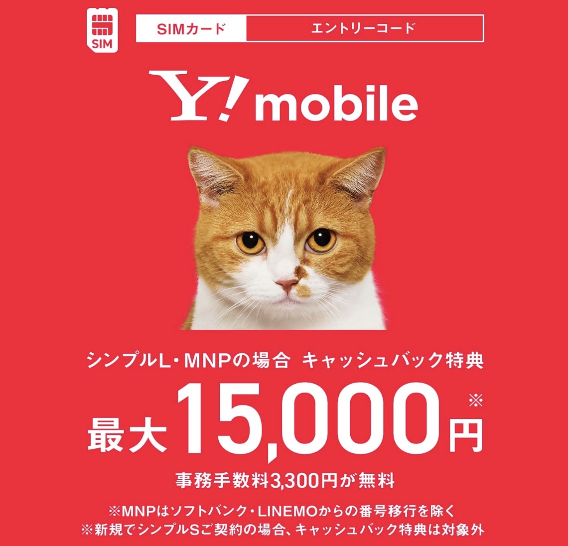 シンプルLの新規契約はキャッシュバック額が最も多いワイモバイルのヤフー店がオススメ。