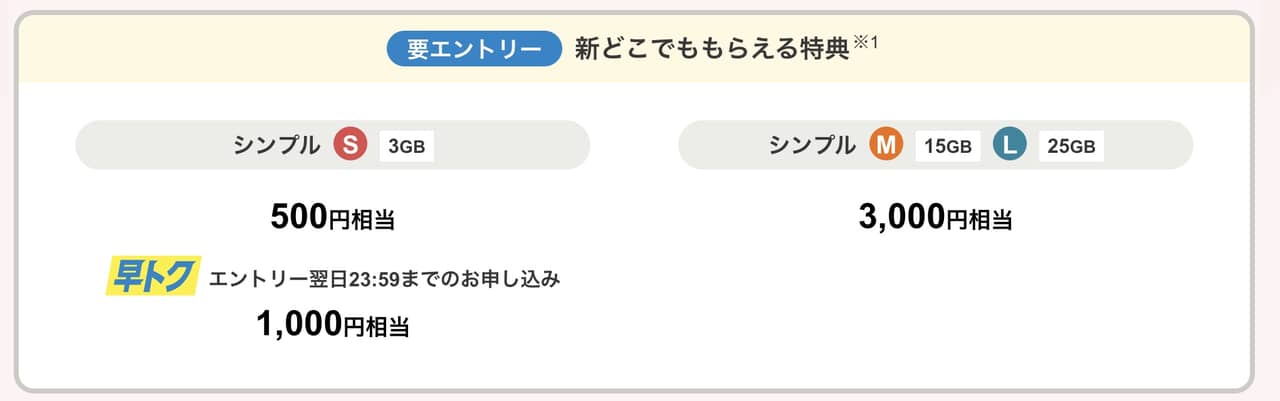 ▼プランSだけエントリー翌日23:59までに申し込みを完了すると+1000円貰えるなど特典が変動するので注意。↓