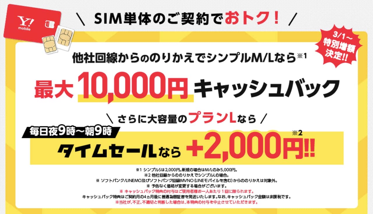 ワイモバイルのSIM単体はどこで申し込んだらお得?キャンペーン内容を比較