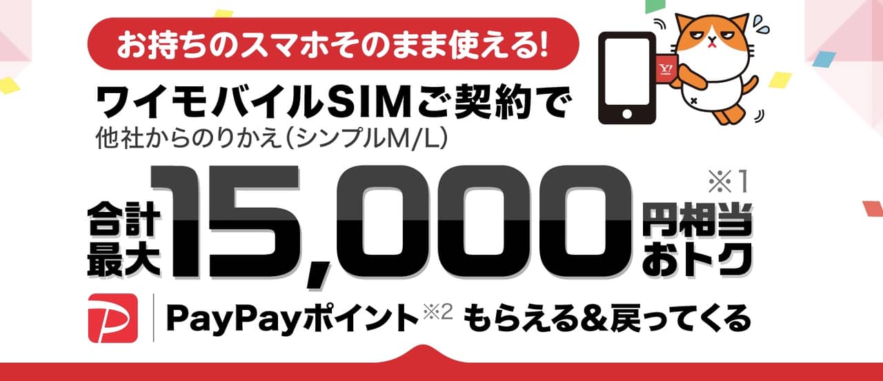 - シンプルM/L:エントリーで3,000円キャッシュバック、SIM契約特典で+5,000円キャッシュバック、PayPayポイント上乗せは最大7,000円(計15,000円お得)