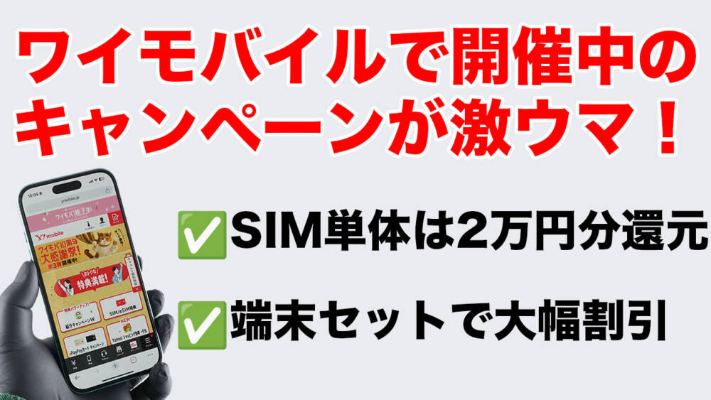 ワイモバイルで開催中のキャンペーンがかなり良いです。スマホを変えずに回線のみ契約も、スマホを新調して回線も引っ越す端末セット申し込みもどっちもお得&激安。さらにワイモバは回線品質も良く低料金。スマホ代の節約にどうぞ。