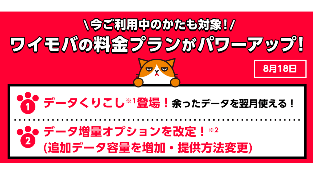 以前伝えていたワイモバイルのデータ繰り越しサービスは8月分から適用とのことです!さらにデータ増量オプションの仕様が変わったことで、面倒な購入手続きがなくなりますよ!