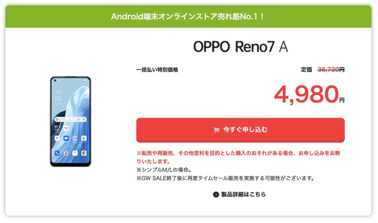 [5/8迄!]ワイモバイルでGWセール!OPPO Reno7 Aが4,980円など多数のスマホが割引に!