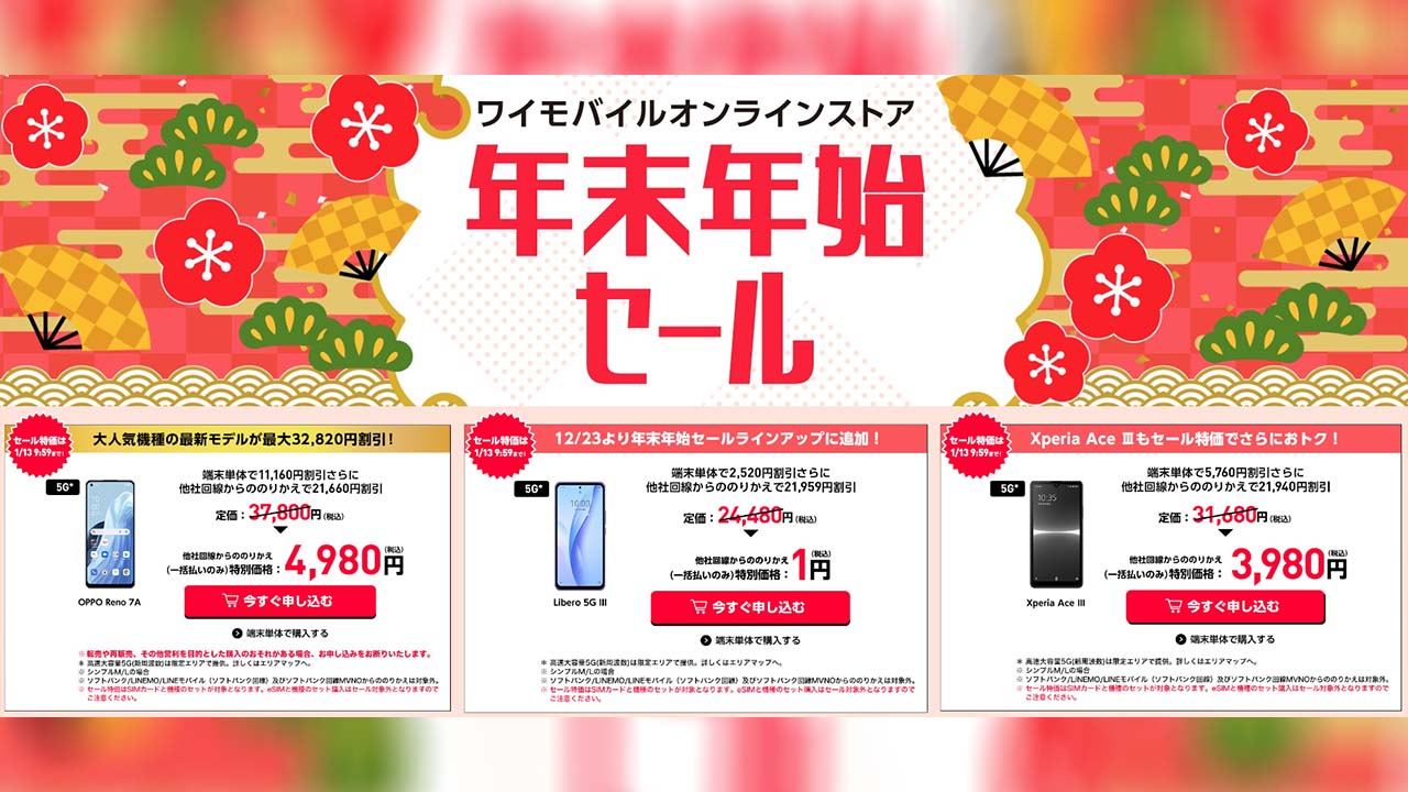 ワイモバイルオンラインストアで年末年始セール。対象スマホの3種がかなり安くなっています!本記事では対象スマホの特徴・セール価格をまとめています。