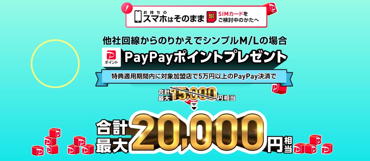 24時間限定で増額中!シンプルM/Lへの乗り換えで必ずPayPayポイント10,000円相当が貰える&PayPay決済で20%戻ってくるキャンペーン(最大10,000ポイント)をやってます!