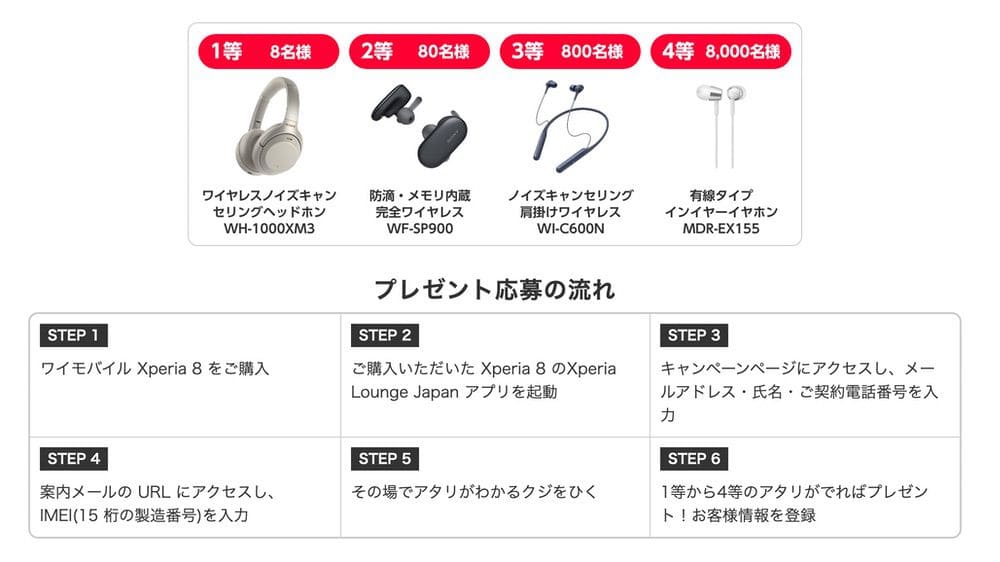申込方法は、「購入期間」中に対象機種(Xperia 8)を購入 →「応募期間」中にキャンペーンに応募 →応募フォームに必要事項を入力 →後日1,000円相当のPayPayギフトカードをメールにて送付、となっております。