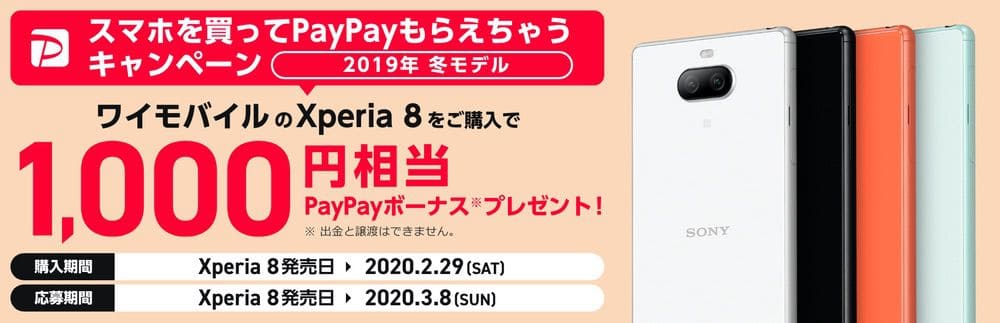 Xperia 8をワイモバイルで購入すると「PayPayにて1,000円相当のボーナスプレゼントキャンペーン」が実施されます。