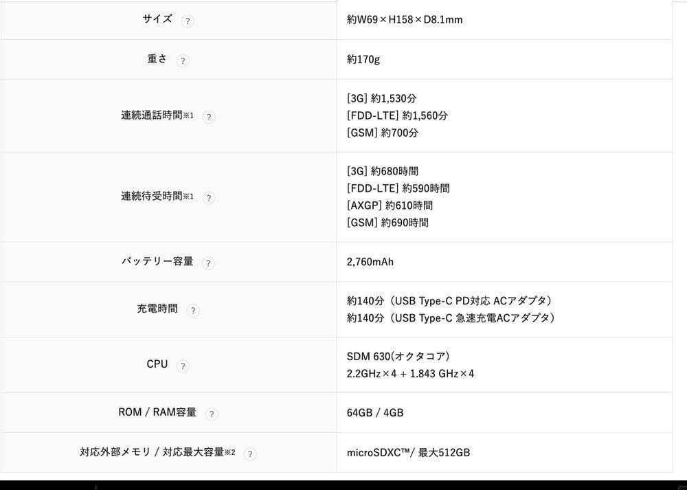 Xperia 8はSoCにSnapdragon 630、OSはAndroid 9 Pieを搭載し、メモリ容量は4+64GBモデルのみとなっています(SDカード追加で最大512GBの容量追加が可能)。