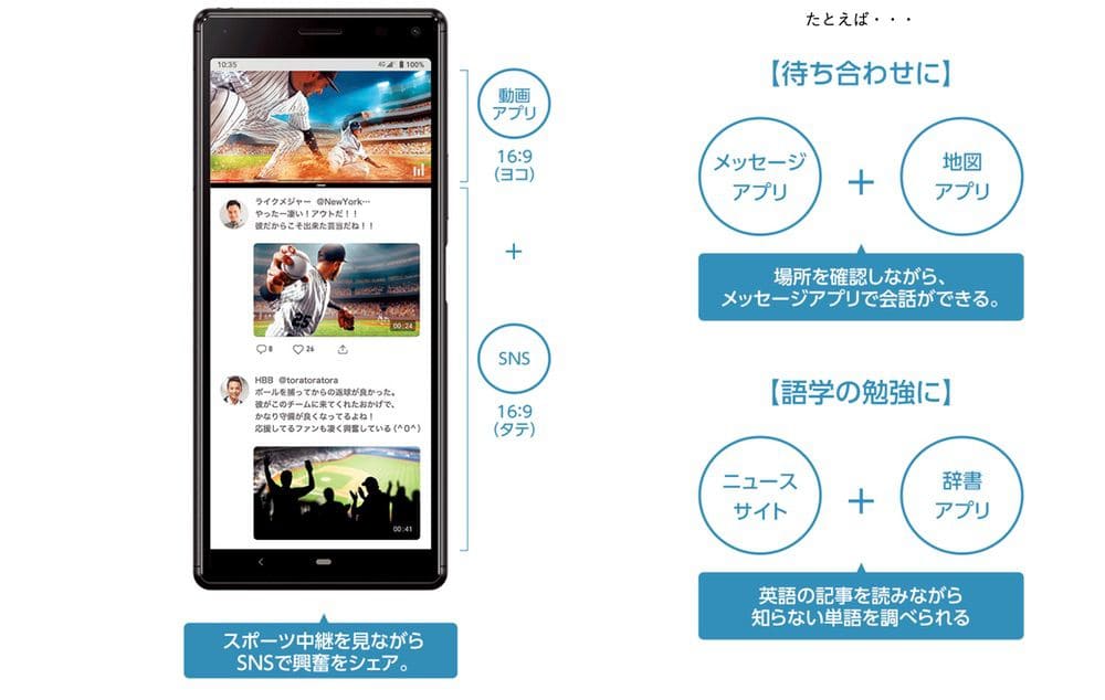Xperia 8でも複数アプリの同時表示が可能となっており、「動画鑑賞+SNS表示」など複数アプリを同時にチェックできるのは嬉しいポイント。