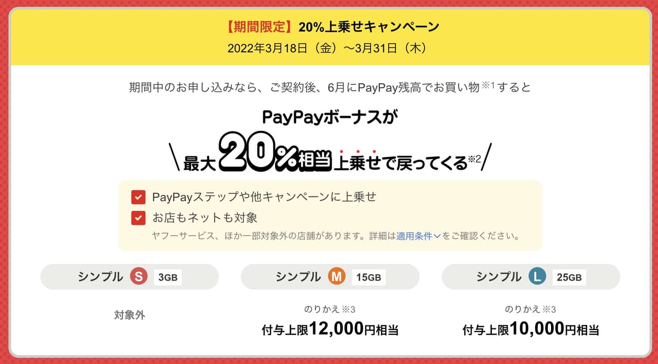 このキャンペーンは期間中に申し込みを行い、「2022年6月1日〜6月30日」の期間にPayPay加盟店でPayPay残高を使って支払いをすると最大20%上乗せされるという内容!シンプルMの場合、満額をもらうなら最大20%が戻ってくるとして60,000円の買い物が必要ってことになります。