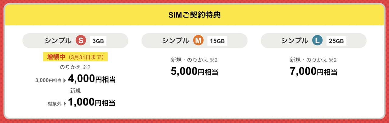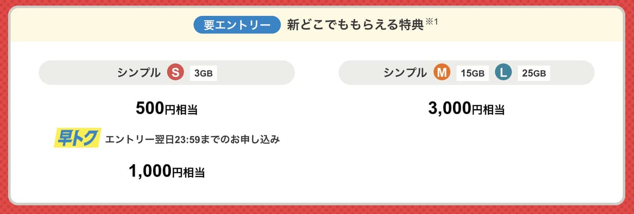 - シンプルS:500円相当(エントリー翌日23:59分までの申込みなら1,000円相当)