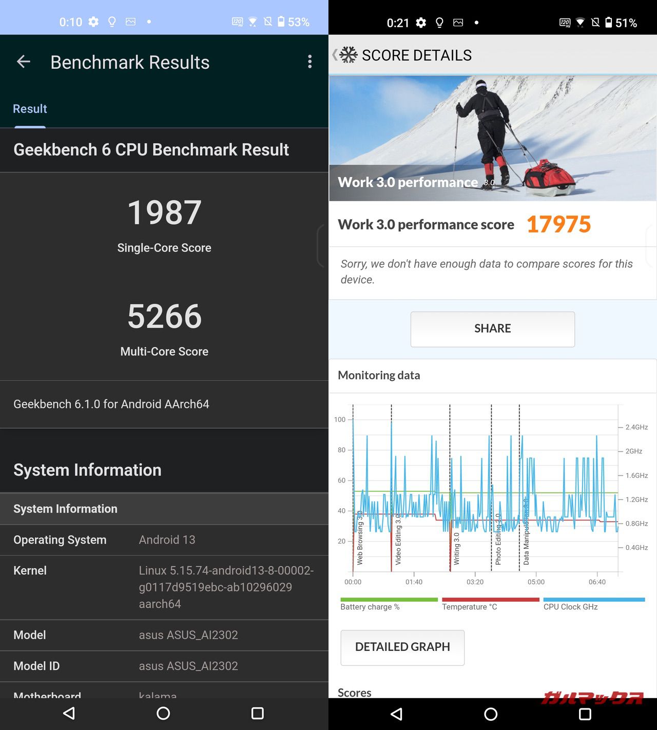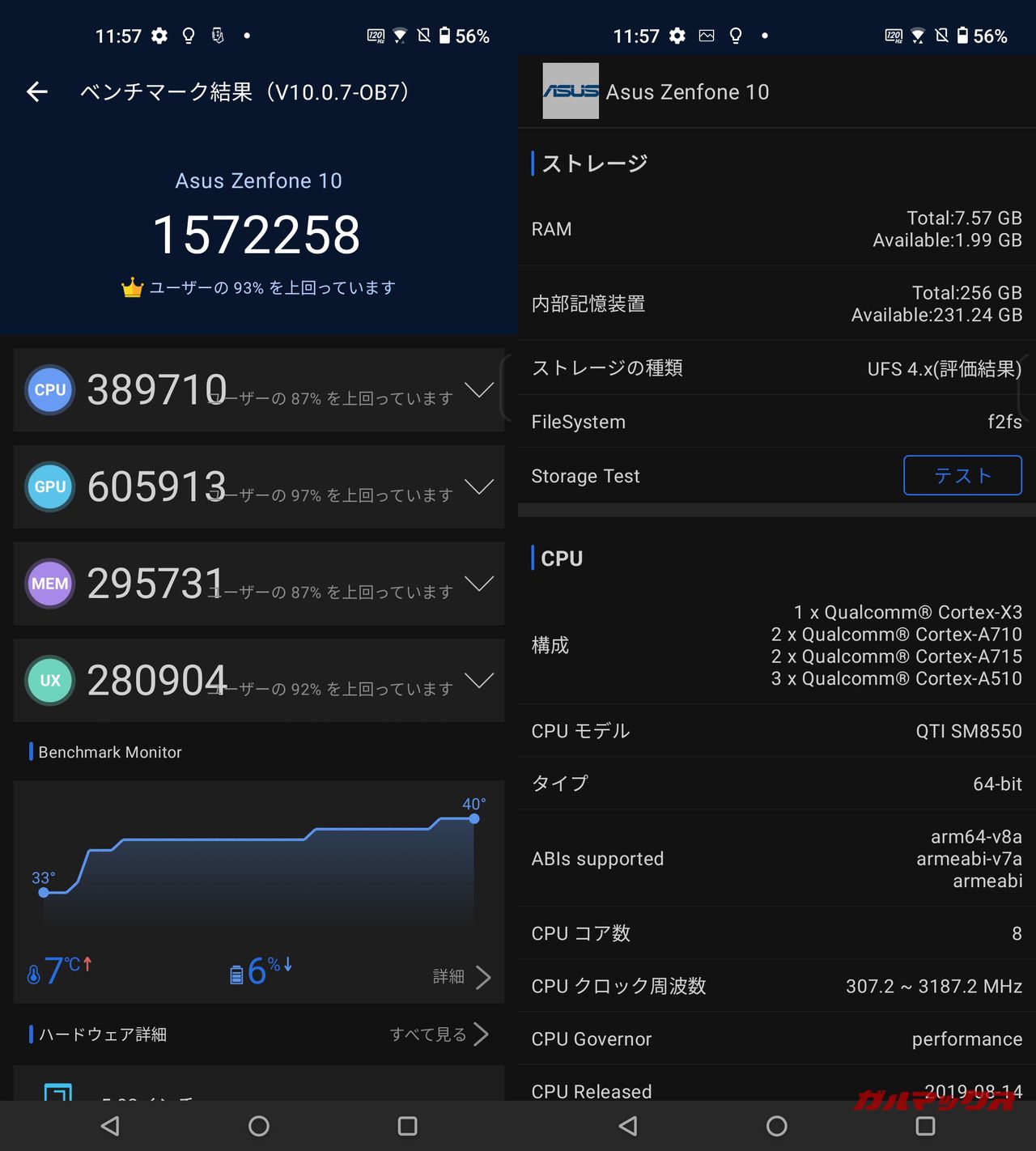 AnTuTu Ver10でのスコアも、Snapdragon 8 Gen 2を搭載する他スマホと水準は変わらない感じだったので、しっかりと性能は引き出せている印象でした。