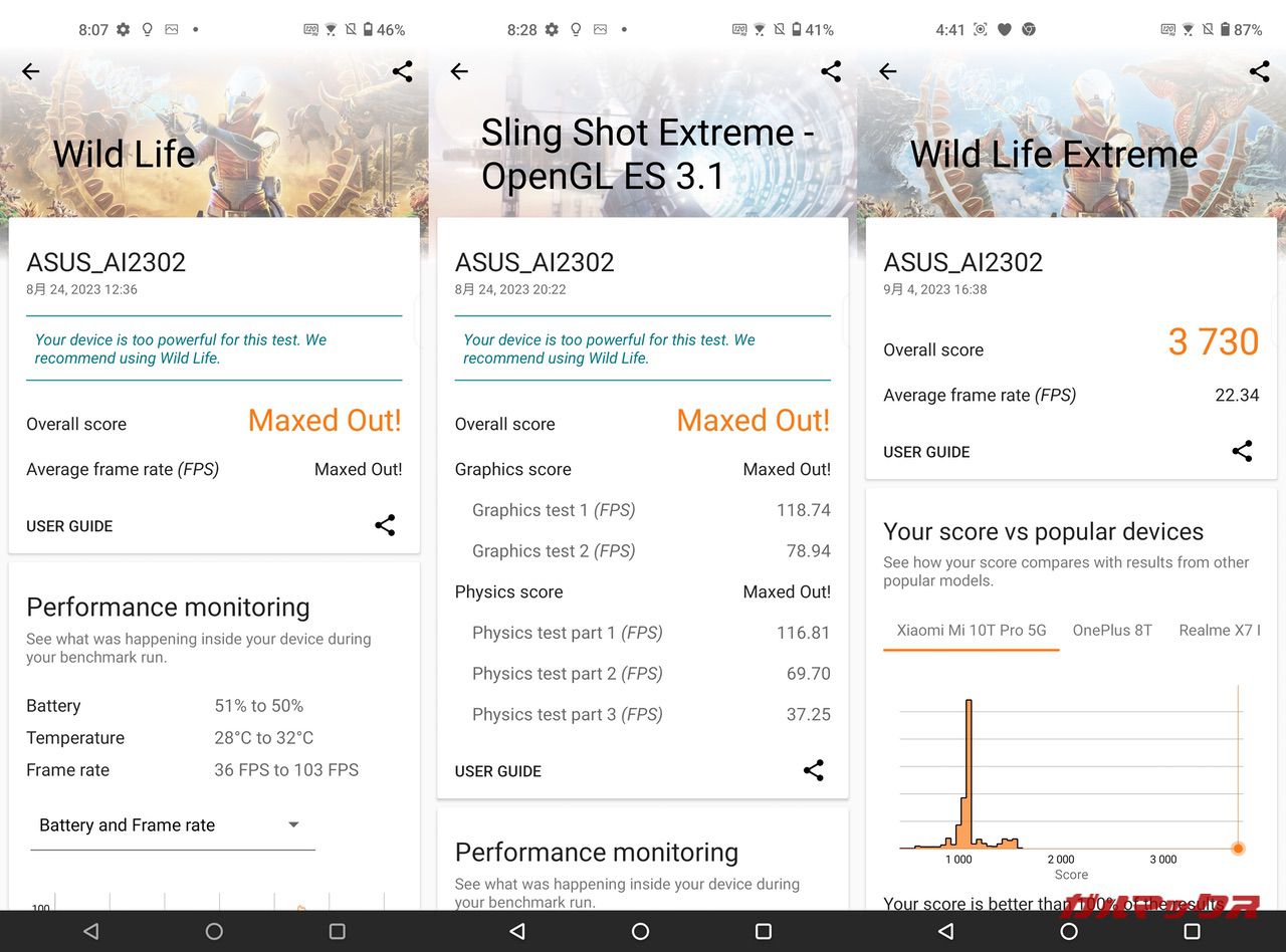 一方で高負荷時の検証では50FPSを割りました。Snapdragon 8 Gen 2搭載モデルだと高負荷時も55FPS以上を維持するモデルもあるので、ちょっと踏ん張りが効かないようです。高負荷時のフレームレート低下はプレイフィーリングにも大きく関わる部分なので、画質設定で落としても良い項目は潔く落としてしまったほうが快適に遊べそうですね。