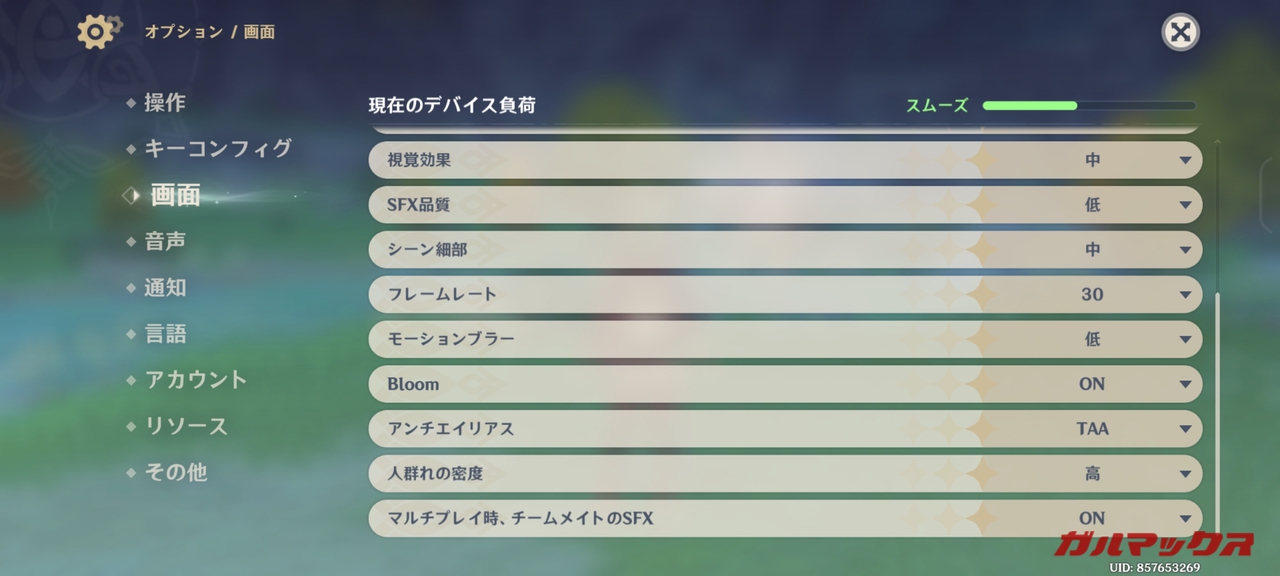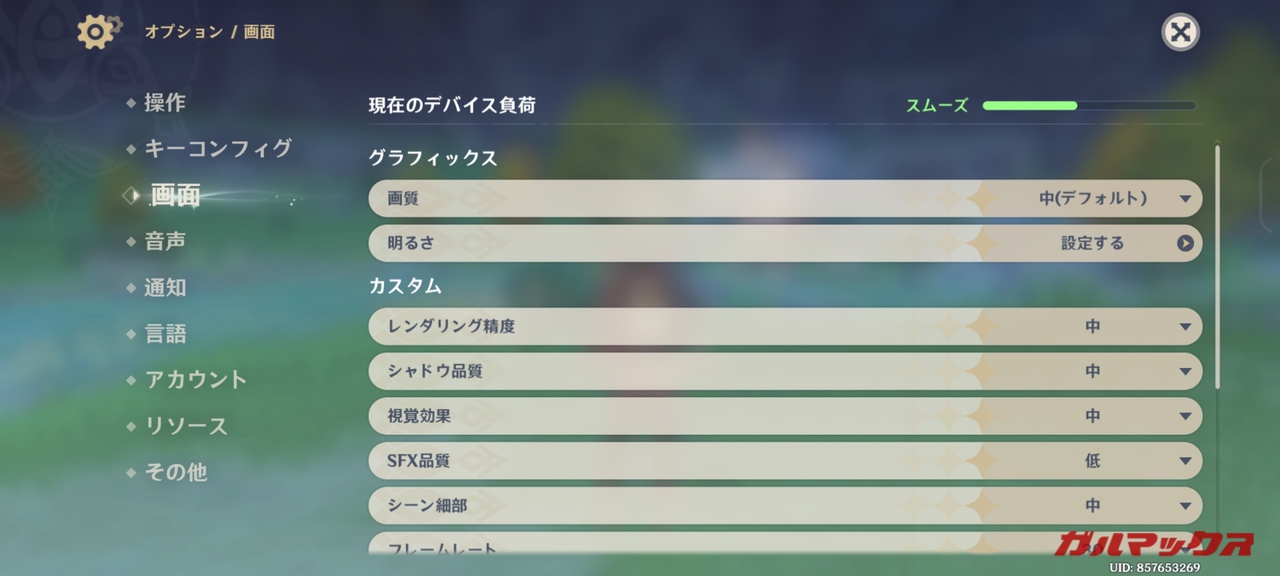 続いては原神。Snapdragon 8 Gen 2はデフォルト設定だと60FPS張り付きになるので、今回は最高設定+フレームレート60で高負荷をかけてみます。