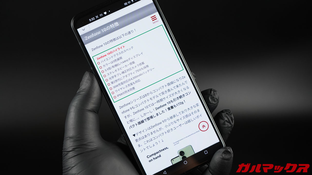 僕はZenfone 10の表示サイズで困りませんが、使う人によっては文字が小さく感じるかも。また、画面が5.9型なのでそれ以上のディスプレイを備えるモデルと比較した場合、動画やゲームの画面がやや小さく感じるはずです。