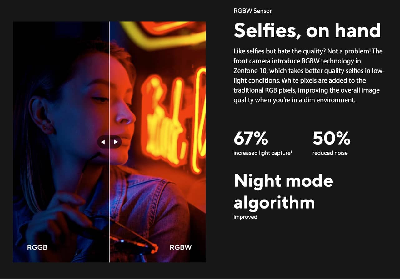 ▼インカメラはRGBWテクノロジーを採用することで低照度でも高画質に撮影できるようになっているとのことです!ちなみにZenfone 9と比較してノイズが50%低減、67%も多くの光を取り込めるようになったそうです!↓