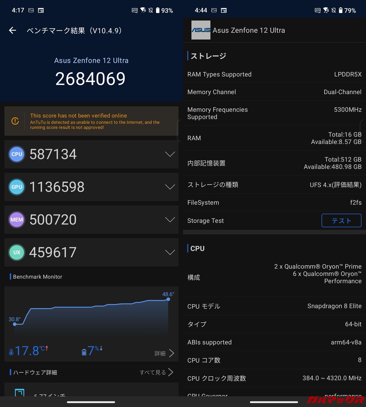 海外ではすでにZenfone 12 Ultraは発売済みでレビューもチラホラと出てます。例えばGSMArenaのZenfone 12 UltraのレビューではSnapdragon 8 Eliteらしいベンチスコアを叩き出し熱制御も高く評価されていました。