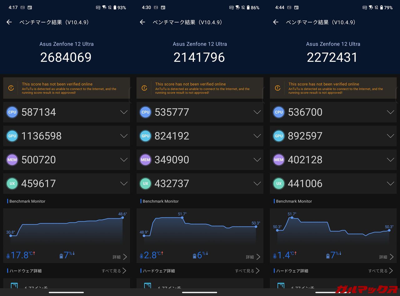 ガルマックスでは高負荷状態の安定性をチェックするためにAnTuTuベンチマークを3回連続で走らせてスコアの推移や温度を確認してます。