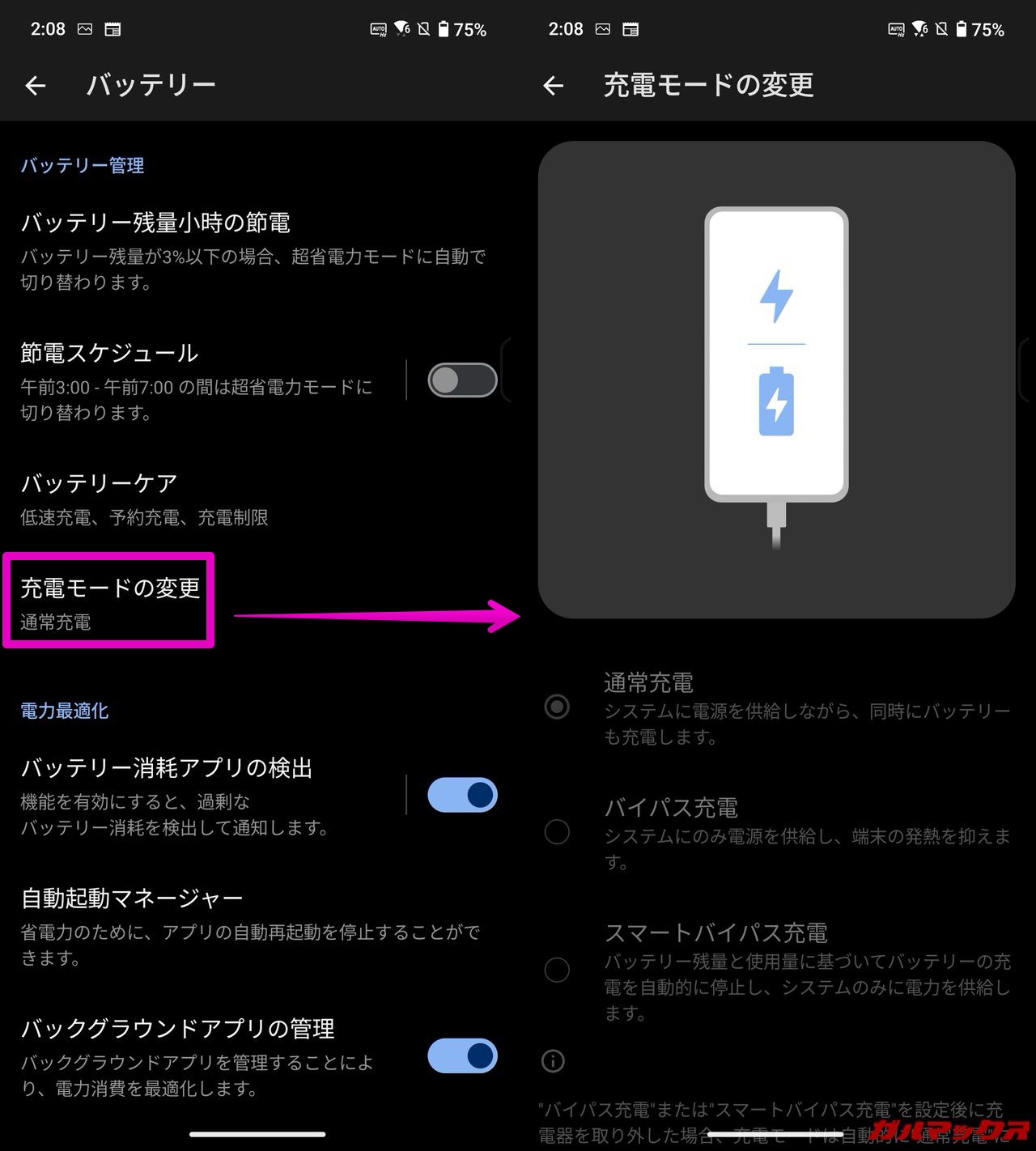 ▼バイパス充電の切り替えはゲームモードでも行えますが、設定→バッテリー→充電モードの変更からもできます。ゲーム以外でも使えるのも良いですね!↓