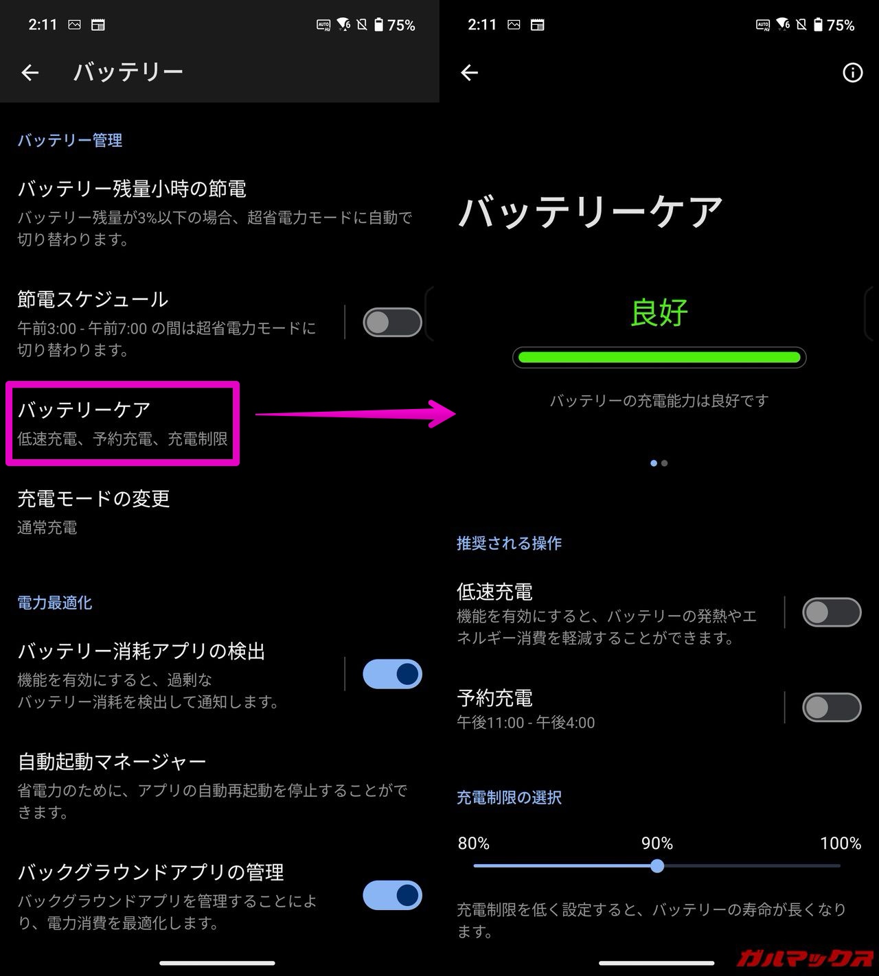 一昔前のモデルだと80%一択というパターンもありましたが、本機は90%で充電を止める設定もできるので、スマホをよく使う人も設定しやすいんじゃないでしょうか。実際に丸1日使ってバッテリー残量に余裕があるなら設定しておきたいですね!