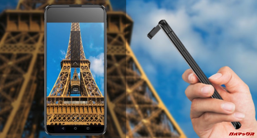 本体正面にはノッチやパンチホールやカメラは一見ありません。実は背面カメラとフロントカメラが兼用になる跳ね上げ式カメラ(フリップカメラ180度回転)が備わっています。この回転式カメラはマニュアル操作だと2°刻みで自由に角度を調節することも可能。