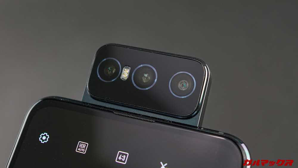 ▼Zenfone 8 Flipは御存知の通りカメラをまんま動かせるフリップ機構が特色!角度は「背面・インカメラ切り替えボタン」を上下にスワイプすると変えられ、さらに角度は3つまで保存することができます。↓