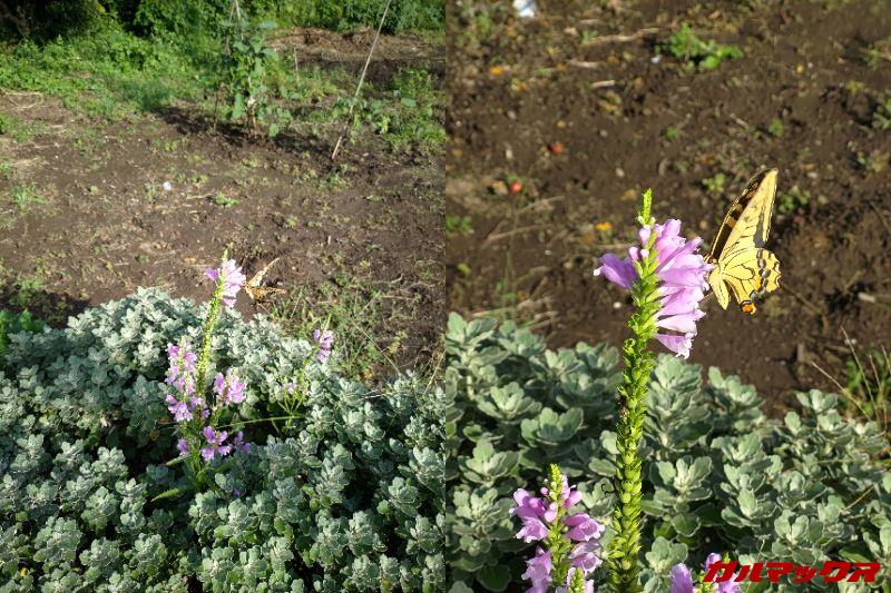 ▼左が通常撮影で右が光学3倍ズームで撮影。写真のようなちょうちょなど、近づくと逃げちゃうタイプの動物撮影で非常に役立ちます!それでいて無劣化で高精細なのでネコチャンなどの動物撮影を好むユーザーさんにとってオススメ。↓