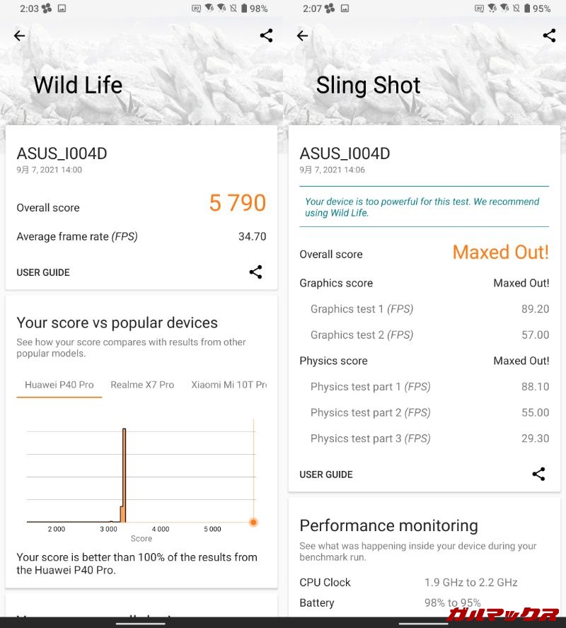 これはSnapdragon 888搭載スマホの宿命。Zenfone 8 Flipも例外ではなく、発熱は結構キツい。Asphalt 9(高画質・60FPS)を試遊してたら20分ほどでかなりアチアチになってしまいます。手で持てないほどではないですが、真夏日だとかなり気になりそう。
