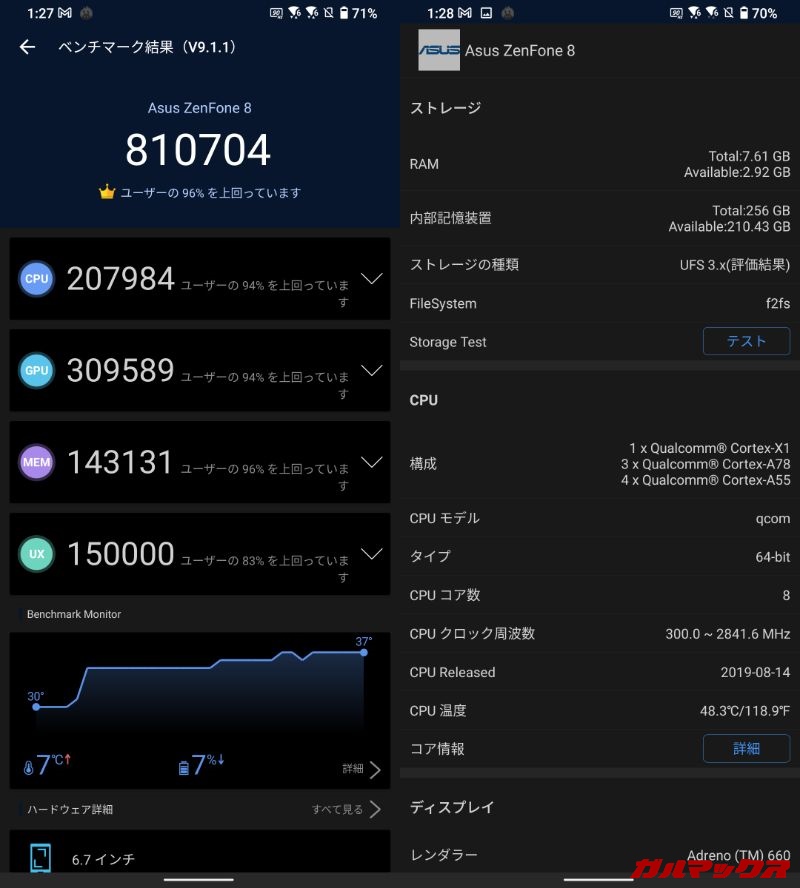 ▼Zenfone 8 Flipの実機でAnTuTu(Ver9)を測定しました!総合スコアは810,704点、GPUスコアは309,589点です!↓