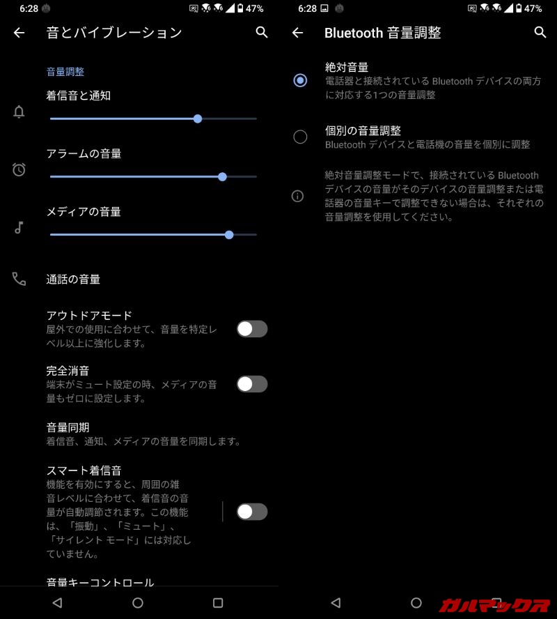 ▼他にもユニークな設定として「周囲環境の音量に合わせて音量を自動であわせるスマート着信音」、「着信音、通知音、メディアの音量を全統一」といった機能があります。この機能は他OSでは見られなかったので結構珍しいかも。↓