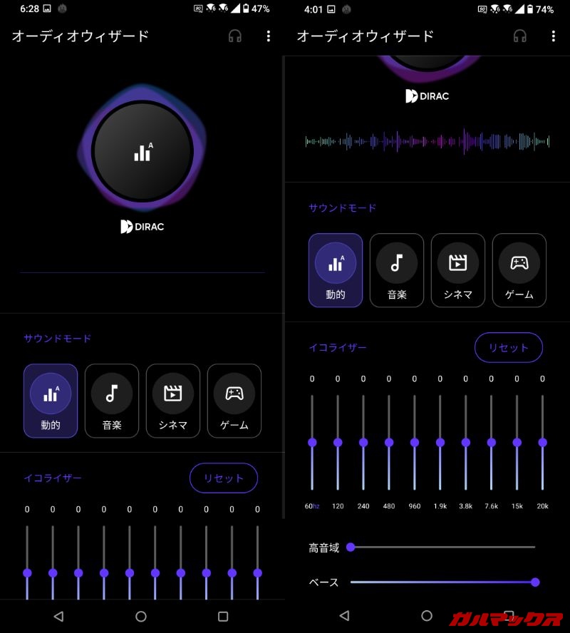 ▼またサウンドの調整が細かく変えられるのもGood。シーンの設定も組めますし、イコライザーもいじれるので、音の聞こえ具合を自分好みに調節できるのです。低音、高音もいじるとかなり違いが感じられるので、いじるだけでも楽しかったっす。↓