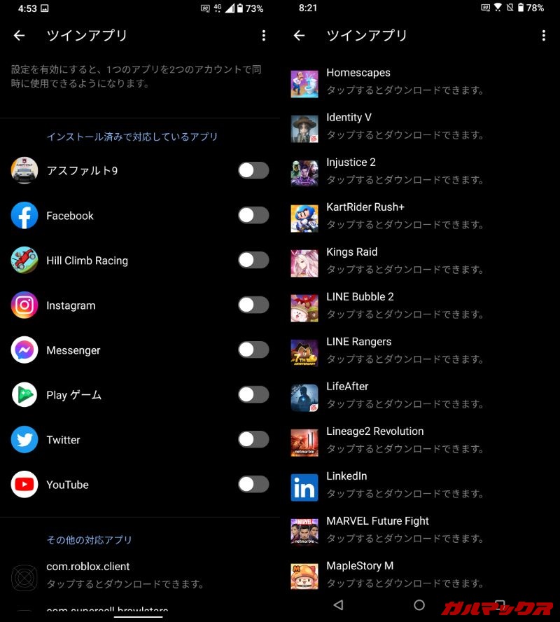▼Zenfone 8 Flipはツインアプリで選べるアプリが各々で異なり、指定されたアプリしか使えない仕様なので注意です。なおPUBG自体は日本語版が非対応、タップするとダウンロードできる項目内のPUBGは海外版なのでダウンロードできませんでした。↓