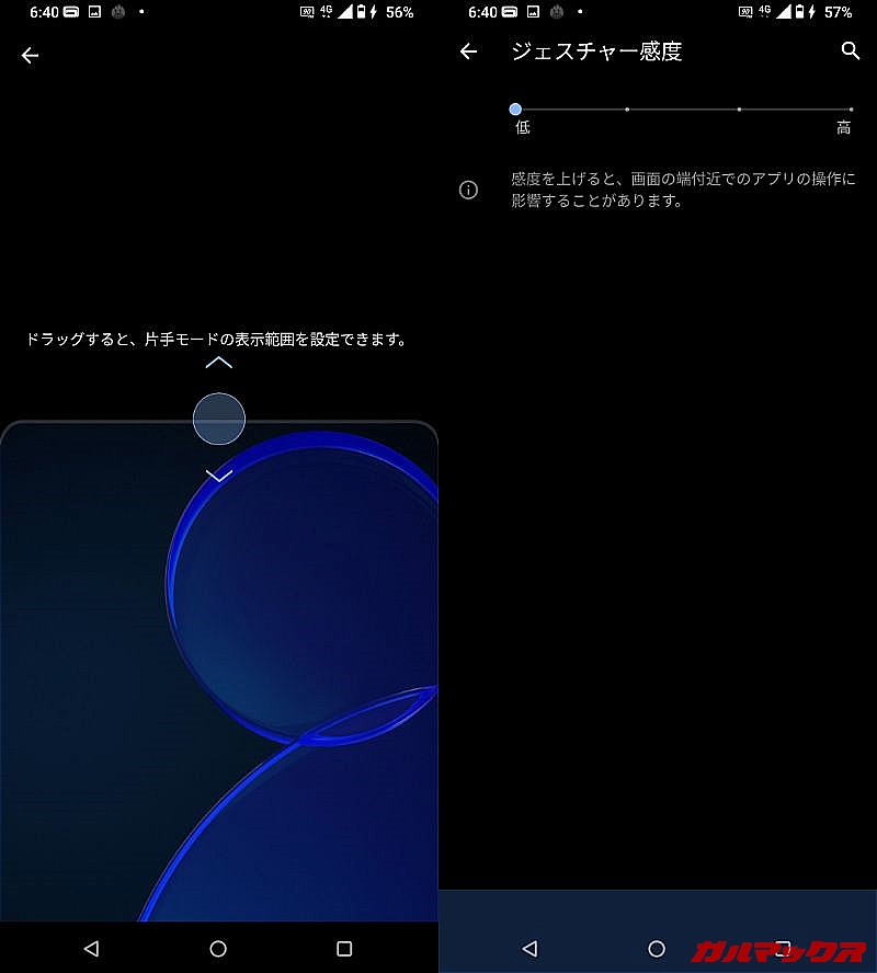 感度や表示範囲も調節可能!筆者の場合だと普通にスクロールしていて誤爆で片手モードになることもあったので感度を低くしてました。一番低くすればほぼナビキーの範囲まで狭くなるので誤爆しにくくなった!もちろん使わないならオフにもできます。