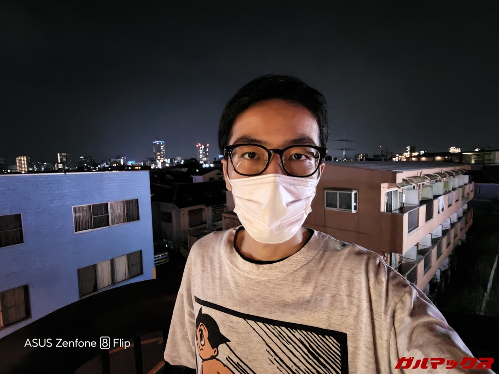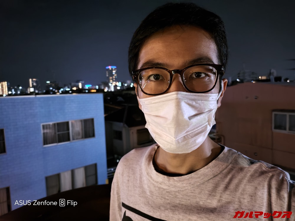 ▼自撮りでナイトモード撮影もできるので、夜景をバックに自撮りもできちゃう!明るさと色合い、ノイズの抑制をうまく両立できている印象です。↓