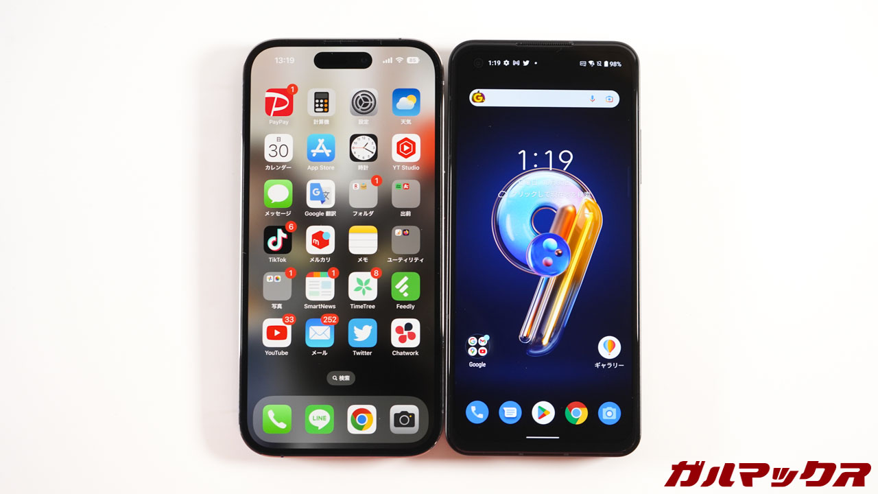 Zenfone 9はコンパクトな部類ですが、iPhone 14 Proと並べると高さはそれほど変わらない印象ですね。