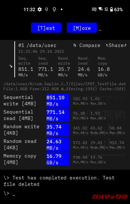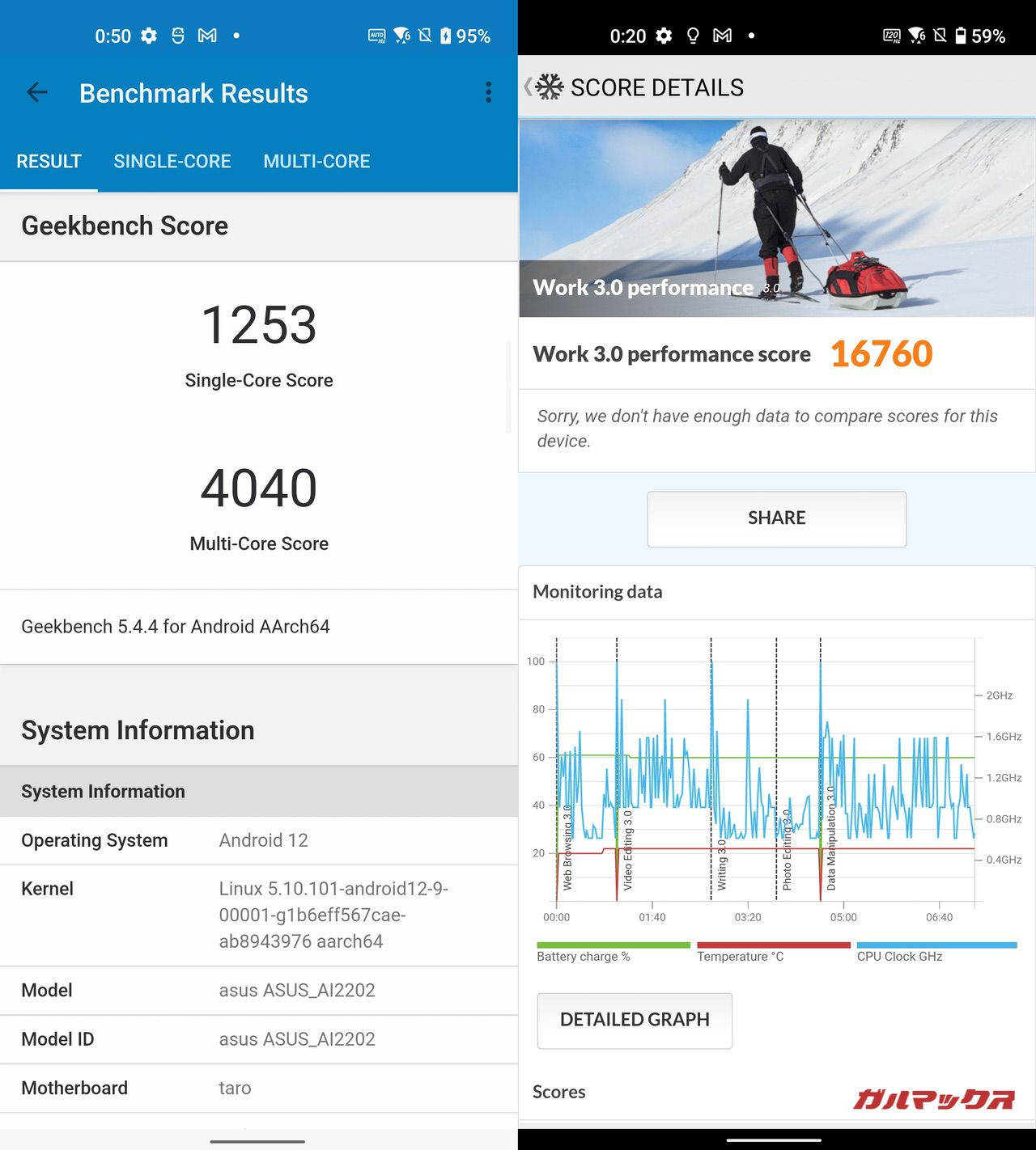 Zenfone 9はSoCにSnapdragon 8+ Gen 1を搭載していて、レビュー機はメモリ16GB+容量256GBです。